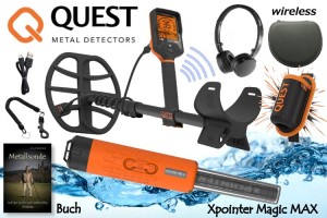 Quest Q35 Metalldetektor mit Funkkopfhörer & Xpointer Magic MAX Pinpointer & Schatzsucherhandbuch Moderner All-Terrain Metalldetektor, wasserdicht bis 5 Meter Wassertiefe und Mehrfrequenztechnik. Das Set enthält neben einem Funkkopfhörer und einem Buch auch einen Pinpointer mit Eisenerkennung und einem Spezialholster.